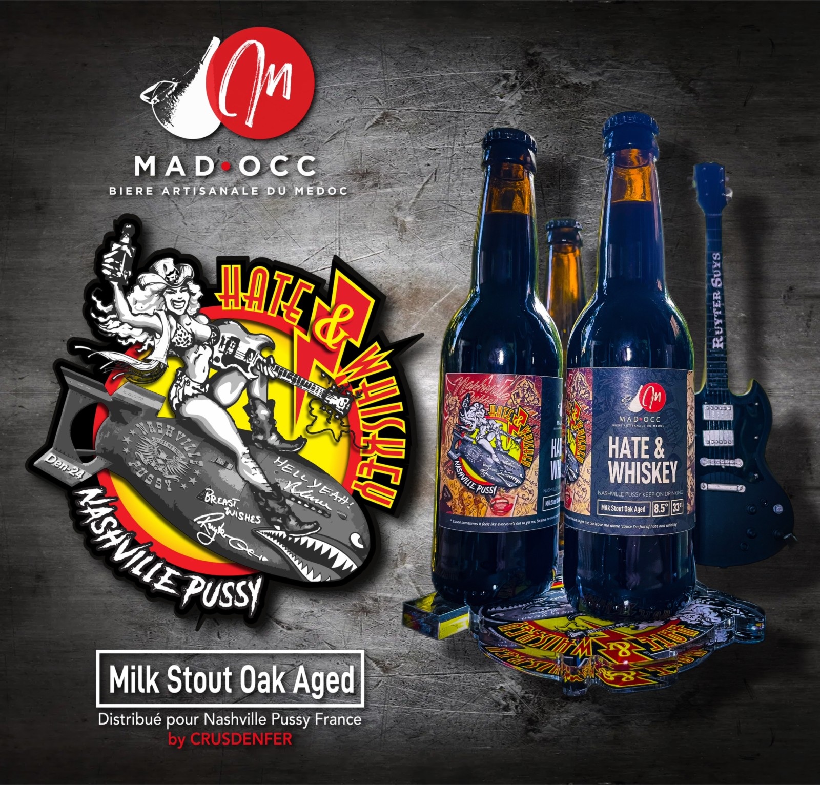 Nashville Pussy Milk Stout Hate and Whiskey!!! On en a écumé quelques soirées d'avant/ d'après concerts, et l'idée de créer une bière plébiscitée par le groupe et qui ressemble à l'esprit du groupe est arrivée. . L'association Crus d'enfer et la brasserie artisanale Mad'Occ propose cette bière brune Stout ( type irlandaise bien connue), mais avec un savoir faire et une complexité inédite. Milk Sout sous-entend un emploi de lactose pour une mousse onctueuse, mais nous ne nous arrêtons pas là. Une simple bière ne serait symboliser l'histoire de ce groupe sans une touche de Bourbon.. Cette bière est élaborée au contact de bois de chêne gorgé de Bourbon Américain cher à nos musiciens d'Atlanta.... Grand Merci à Hamilton pour les visuels et création de l'étiquette "Hate & Whiskey"!
